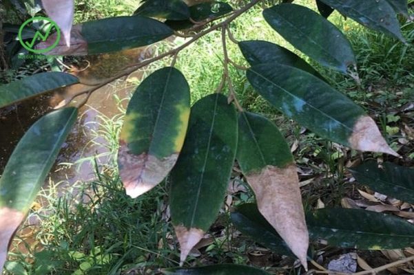 Bệnh cháy lá trên sầu riêng do nấm Rhizoctonia solani gây ra.